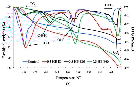 After the initial rapid decline, the actual weight loss rate stabilised between 200 °C and 350 °C. The second significant weight loss was observed between 350–600 °C, where portlandite started decomposing until completion of the process at around 550 °C [54,55]. The mass loss in this range was recorded to be 5.54% in PF E60 and 3.49% in HB E60. However, after 400 °C, mass loss was significantly reduced in FRC than in control specimens. In the 650–800 °C range, the release of carbon dioxide in addition to the decomposition of C–S–H (II) into wollastonite and larnite, contributed to the mass loss, which accounts for 3.645%, 4.11% and 4.26% of mass loss in Control E60, PF E60 and HB E60, respectively.