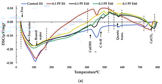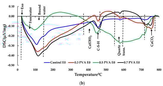 According to Noumowé and Li et al. [59,60], continuous dehydration of the C-S-H gel and melting of PF were seen between 200–300°C and at 480 °C, and a slight variation of heat flow was observed in those ranges. Between 400–500 °C, significant decomposition of Ca(OH)2 occurred with peak shifts with increased heat exposures. For recurrent exposure of FRC samples to high temperature, a significant reduction in peak intensity at 440 °C (in Figure 15a) was recorded in contrast to that of E0, particularly for 0.3% PF reinforced concrete after 60 exposures. This trend may be due to the continuous dehydroxylation of portlandite in the cement matrix. The phase transition α to the β phase of quartz was recorded at around 573 °C with a visible peak on DSC plots. Between 700–800 °C, decomposition of calcium carbonate occurs, which release carbon dioxide from the concrete. Sun and Xu [34] also found that between 700 and 800 °C, the calcium carbonate (CaCO3) decomposes, thus permitting CO2 to liberate from the concrete.