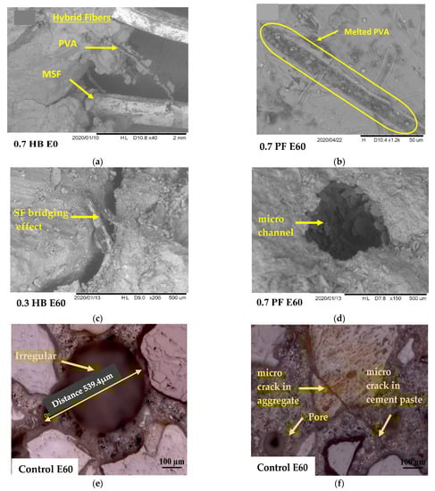 SEM/optical analysis was done on the polish surface taken from the specimen’s core (up to 20 mm depth) to understanding the fibre–matrix interactions after repeated high temperatures and HC fluid exposures. Figure 16a shows PF fibres strewed in original FRC samples, and Figure 16b shows melted PF fibre due to high-temperature exposure. In the control specimen, repeated HC fluids exposure and high temperature create extra vapour pressure and heat-induced thermal cracks that may have caused the spalling (Figure 16e,f). Due to repeated exposure to 175 °C, there was a significant difference between PF and SF FRC porosity. When the PF fibre reinforced concrete was heated up to 175 °C, PF fibres start shortening in length due to relaxation, melting occurs. These micro-channels form a network of more permeable cement matrix, which contributes to the release of gas and water vapour, thus resulting in the reduction in the pore pressure [58,61]. This phenomenon helps to reduce the spalling tendency of concrete exposed to high temperature. Due to SF’s high melting temperature, the development of such a microchannel was not observed in SF reinforced concrete. However, SF’s presence helps bridge the cracks that develop due to repeated thermal exposures, as seen in Figure 16d.