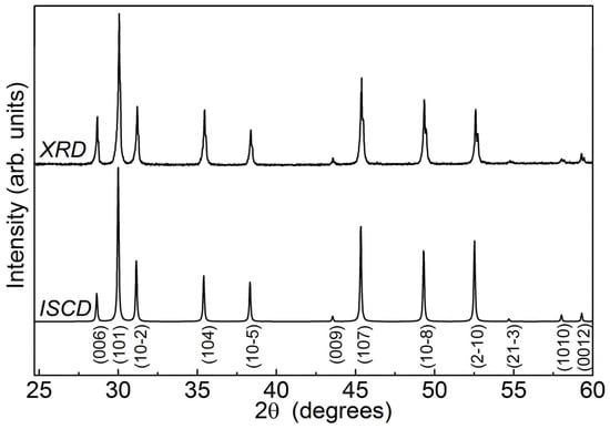 The initial CuCrS2 powder sample was synthesized from copper and chromium oxides (CuO, Cr2O3) with a purity of 99.99% (Millipore Sigma, St. Louis, MO, USA; MSE Supplies LLC, Tucson, AZ, USA). A mixture of initial metal oxides in a horizontal glassy carbon boat was placed in a quartz reactor. The air was removed from the reaction volume by argon and ammonium rhodanide (NH4SCN) decomposition products of gas flow. The reaction mixture was heated to 1050 °C and ground for several times during the synthesis. The completeness of sulfidization was controlled by powder X-ray diffraction (XRD) and by weighing the sample. The XRD experiment was carried out using non-monochromatic CuKα-radiation (Shimadzu XRD 7000S diffractometer, Shimadzu Corporation, Kyoto, Japan). The XRD pattern of the synthesized CuCrS2 sample is shown in Figure 1. The XRD pattern indicates that the synthesized sample is composed of a single phase corresponding to the rhombohedral space group (R3m). The positions of diffraction peaks and intensity ratios are in good agreement with the data of the Inorganic Crystal Structure Database (denoted “ICSD” in Figure 1) [30]. The calculated unit cell parameters a = 3.480(4) and c = 18.689(5) Å correlate well with previously reported and reference data [11,27,30].