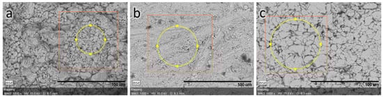 The ceramic samples were prepared using the synthesized CuCrS2 powder sample in the course of a two-step procedure. At the first step, the samples were subjected to 10 MPa cylindrical compression at room temperature in air. At the second step, the compressed samples were treated under different conditions (Table 1). The composition of compressed samples (Table 2) was analyzed by scanning electron microscopy (Hitachi TM3000, Tokyo, Japan, microscope equipped with a Bruker EDS QUANTAX 70 analyzer, Billerica, MA, USA). The backscattered electron (BSE) images are shown in Figure 2. The SEM images were made with a 1000× magnification. The elemental composition of the studied samples correlates well with the theoretical reference concentration. The EDS analysis was performed with an accuracy of ~1%. The SEM images indicate that the sample’s density increases in the series powder→argon treated sample→vacuum treated sample. The most homogeneous surface was observed for the vacuum treated ceramic sample (Figure 2). This fact agrees well with the density measurements of ceramic samples (Table 1).