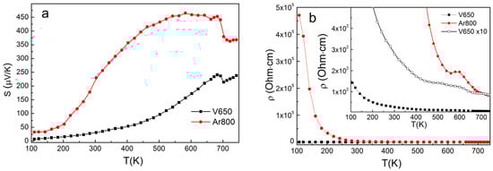 Figure 3a shows the temperature dependencies of the Seebeck coefficient (S) for compressed CuCrS2 samples. The positive sign of S indicates the p-type conductivity. This fact is in good agreement with previously reported data [11,12,13,14,15,16]. Note that the treatment procedure does not affect the conductivity type. The largest S value of ~450 µV/K (at T ~550 K) was observed for the argon treated sample at 800 °C (Ar800). The S values measured for the vacuum treated sample at 650 °C (V650) are lower than those measured for the vacuum treated sample. On the other hand, the electrical resistivity for the argon treated sample is one to three orders larger than for the vacuum treated sample (Figure 3b). This can be due to the fact that the argon treated sample has a lower density than the vacuum treated sample (Table 1). At the same time, the electrical resistivity of both samples decreases with temperature, which is typical of semiconductor materials. Thus, annealing the sample in the argon atmosphere can be an efficient procedure to increase the value of the Seebeck coefficient of CuCrS2 based materials. The hot vacuum pressing procedure increases the sample density. The sample treatment in vacuum at 650 °C results the optimum Seebeck coefficient value (~200 uV/K), typical for SnSe- and GeTe-based thermoelectric materials [28,29]. Thus, the sample treatment procedure could be used to optimize the Seebeck coefficient value both the cationic substitution of CuCrS2-matrix [11].