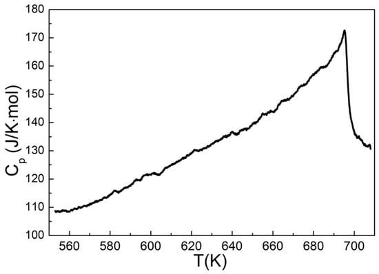 Above 600 K, the Seebeck coefficient and electrical resistivity exhibit similar temperature dependencies for all studied samples. Both S(T) and ρ(T) temperature dependencies exhibits inflection features in the corresponding temperature region at T~600–700 K. This fact correlates well with the data reported in [15]. Note that the presence of inflection is not affected by the treatment procedure and can be therefore related to physical properties of CuCrS2. For instance, the order-disorder phase transition (ODT) occurs in the same temperature region [17,18,19,20,21,22,27]. Differential scanning calorimetry (DSC) is the most common experimental technique to study phase transitions. The DSC sensitivity for ODT in similar chalcogenides AgCrS2 was reported in [26,32]. However, DSC has not yet been used to study ODT in CuCrS2. The temperature dependence of heat capacity is shown in Figure 4. The investigated temperature region exhibits a single peak at 695 K corresponding to an abrupt Cp decrease. The shape of the Cp(T) line is characteristic of the second-order phase transition. Thus, the observed phase transition corresponds to the ODT and agrees well with the previously reported data [26,27,32]. The inflection feature on the S(T) curves lies in the same temperature region as the ODT. Thereby, the decrease of the Seebeck coefficient at T > 700 K is due to copper migration from the “ordered” tetrahedral sites to the “disordered” ones [26,27]. The positions of ρ(T) infection features are shifted to lower temperatures compared to those exhibited by S(T) and Cp(T) temperature dependences. Note however that inflection features appear on the temperature dependencies of electrical resistivity as a result of ODT [33]. Since thermopower, electrical resistivity and heat capacity temperature dependencies involve different physical processes, the inflection point of these dependencies may occur at different positions. Hence, the observed inflection features on S(T), ρ(T) and Cp(T) curves are of the same origin and correspond to the order-to-disorder transition.