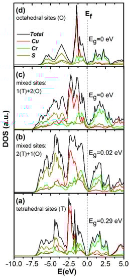 However, the contribution of copper states is shifted to the high energy region and is localized at −1.5 eV. The character of sulfur and chromium pDOS distribution is generally preserved. Nevertheless, the main contribution of sulfur is slightly shifted to the high energy region as a result of the valence band narrowing. Note that the intensity of the total DOS at the conduction band bottom is lower than those corresponding to the tetrahedral localization of copper atoms. The character of pDOS distribution in the conduction band remains almost unchanged, and the major contribution is due to chromium states. The band gap vanishes as sulfur, chromium and copper states shift to the Fermi-level region (Figure 5d).