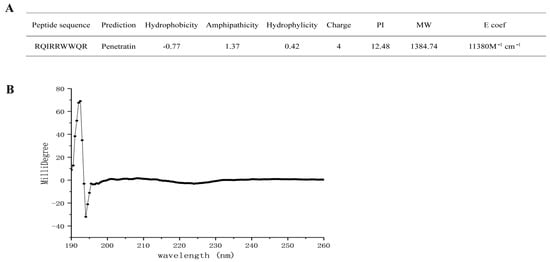 The sequence and structure of RR9 are shown in Figure 1A. According to the prediction results of the software, this peptide is a short peptide composed of nine amino acid sequences. It has a linear α-helical structure that is highly positively charged (+4), amphiphilic, and has a molecular weight of 1384.59 Da in an aqueous medium (Figure 1a). The secondary structure of the peptide is related to its properties, so we used CD spectroscopy to detect the structure (Figure 1B). As for the qualitative secondary structure assignments, the minimum signal was located at 218 nm while the maximum one was at 195 nm. Alternatively, no positive peak was assigned to any random coil with a minimum signal at 198 nm [23,24]. None of the CD signals of RR9 matched the above peaks, indicating that RR9 is unstructured.