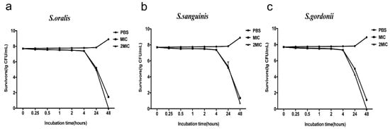 Antimicrobial activity kinetics of RR9 against three single species ((a) S. oralis; (b) S. sanguinis; and (c) S. gordonii ). Bacteria treated with RR9 were cultured for 48 h.
