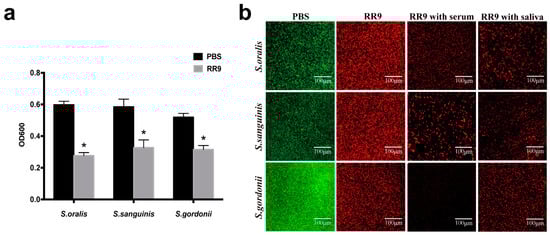 The biofilm susceptibility test showed that a reduced OD value was observed from the bacterial biofilms treated with RR9 compared with the control group, and their anti-biofilm properties were significantly different (p < 0.05). RR9 exhibited different anti-biofilm properties against the three different strains of streptococci, though the differences were statistically insignificant (p > 0.05) (Figure 3a). The green and red spots in the CLSM images represent the living and dead bacteria, respectively. In the control group, the biofilm of streptococci was dense and mainly green in the CLSM image. However, in the RR9 groups with saliva or serum, the biofilm of streptococci was loose, with a decreased number of living bacteria but increased number of dead bacteria. No significant difference was observed when comparing the RR9 group with the RR9 groups with saliva or serum (Figure 3b).