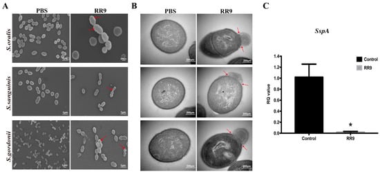 SEM images of S. oralis, S. gordonii, and S. sanguinis biofilms treated with RR9 at 25 μg mL−1 (MICs) for 24 h (A). TEM images of the bacteria treated with RR9 at 25 μg mL−1 for 12 h (B). Red arrows: released cellular contents and disrupted cell membrane. (C) Gene expression of sspA in S. gordonii treated with RR9 or left untreated. S. gordonii planktonic cells (1 × 108 CFU mL−1) and cells treated with RR9 overnight at 25 μg mL−1 (MICs) for 24 h were harvested separately for RT-PCR. * p < 0.05.