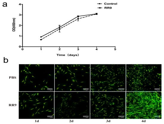 After 1 day of incubation, the number of HGFs in the experimental and control groups was low and the cells were in long fusiform. After 2 days, the number of cells in the two groups increased significantly and a few cells were connected. The number of cells in the experimental and control groups further increased, and the connection between cells was easier to observe (Figure 5a) after 4 days. No significant difference was obtained by comparing the OD 450 values between the two groups (p < 0.05). The results of AO/EB fluorescence staining and CLSM (Figure 5b) showed that, in the RR9 group, the living cells (green fluorescence) covered the whole surface of the coverslip in a long fusiform with few dead cells (red fluorescence) attached, and the number of cells gradually increased with culture time. Therefore, the negligible cytotoxicity and good biocompatibility of RR9 (25 μg mL−1) are ascertained.