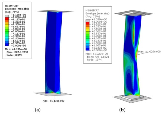 Figure 4. Maps of damage parameter for an angle column: (a) M-1; (b) M-2.