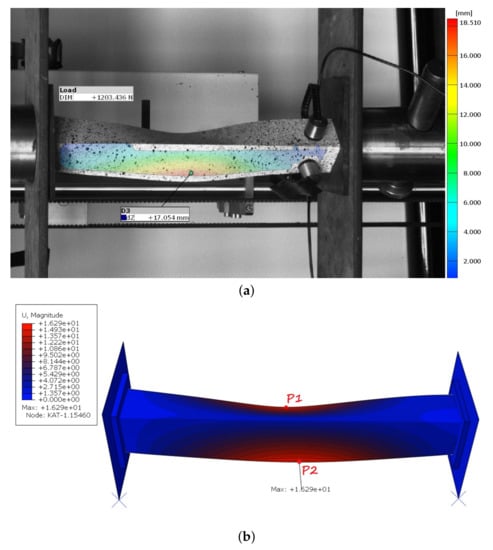 The damage initiation in M-2 model occurred mainly in the middle part of one of the flanges, while the place of damage initiation with the Hashin criterion did not change in the first model. Additionally, it was checked in the M-1 model whether the damage mechanism occurring in the M-2 model would appear in further analysis. After completing the necessary research, it was found that the damage mechanism from second model was not observed in the first model. From a practical point of view, the angle section under compression should damage closer to the center than at the edge of the profile. Furthermore, the maximall deflection in the middle of the column was observed in the experimental tests (Figure 5a). It was compared with the second numerical model Figure 5b.