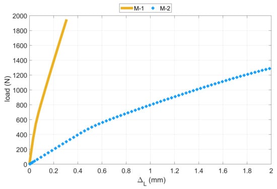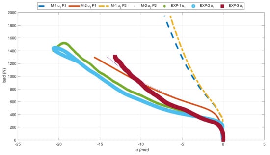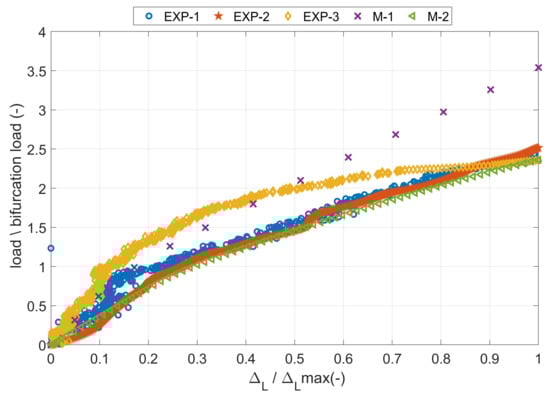 Dimensionless equilibrium paths determined from experimental and numerical tests are presented in Figure 10. A very good agreement of the results was obtained for the M-2 model, while the results from the M-1 model demonstrate a different damage mechanism. It is also clearly visible in Figure 11, where the equilibrium paths obtained from numerical models are presented. The shortening of the M-1 model was around 550% lower than for the second one. Moreover, the damage initiation load obtained in the first model is higher by about 50% compared to the results of the second model. In addition, it is worth noting how much influence the flexible pad (i.e., the appropriate stiffness of the support) has on the behavior of the thin-walled laminate L-shaped column. It can be suspected that, by increasing the stiffness of the pads, the equilibrium curve should be placed between the presented results.