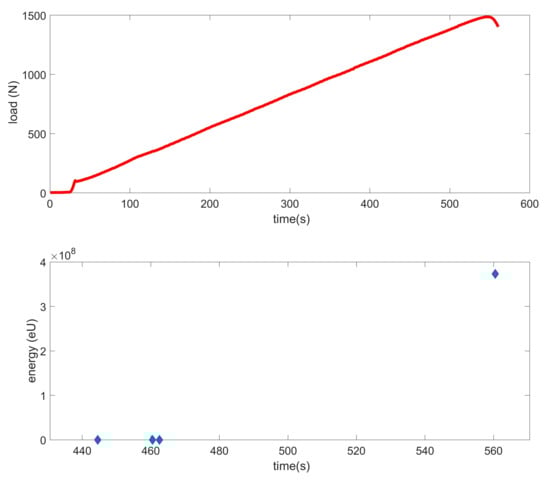 Figure 7. The load and acoustic energy signal versus time for the second real column (EXP-2): Aramis signal—red line; energy signal of AEM—blue mark.