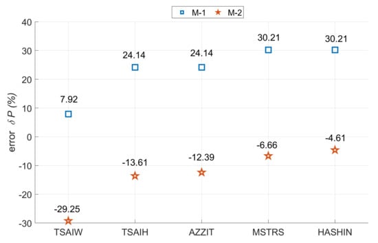 Figure 9. The relative error between numerical and experimental results: δ P = ( ( P M E S P E X P ) / P M E S ) × 100 p e r c e n t .