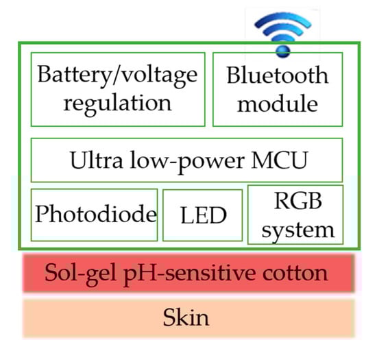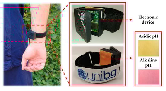 - Trovato, V.; Vitale, A.; Bongiovanni, R.; Ferri, A.; Rosace, G.; Plutino, M.R. Development of a Nitrazine Yellow-glycidyl methacrylate coating onto cotton fabric through thermal-induced radical polymerization reactions: A simple approach towards wearable pH sensors applications. Cellulose 2021, 28, 1–22. [Google Scholar] [CrossRef]