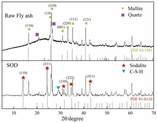 The XRD patterns of fly ash and its synthetic N-A-S-H are shown in Figure 1. The measured XRD data were analyzed by Jade 6.0 software and matched with the mineral standard diffraction pattern to determine the mineral composition. The results show that the main crystalline phases of FA used in this study are mullite (Al6O13Si2) and quartz (SiO2), containing large amounts of silicon and aluminum components. The XRD pattern contains a clear broad between 20° and 30°, indicating the presence of an amorphous glass phase in the original ash [27]. After the fly ash is heated and de-siliconized by alkali dissolution, a small amount of quartz is dissolved with the glass phase and the aluminosilicate gel formed is transformed into the less soluble N-A-S-H. The specific reaction process is derived from the following Equations (5) and (6).