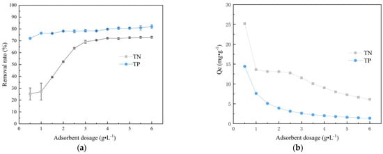 The effect of SOD dosing as a variable on the removal of ammonium and phosphate from water is explored in this study. As the amount of adsorbent increases, the change in removal rate (Figure 5a) and unit adsorption capacity (Figure 5b) was shown in Figure 5. In the figure, TN means total ammonium, TP means total phosphorus. Under a constant concentration, the removal rate of the material for ammonium gradually improves as the adsorbent dosing increases and tends to equilibrium after a certain degree, while phosphate removal rate presents a slow adsorption rate due to the high starting efficiency. When the dosage is lower than 3 g·L−1, the removal rates of nitrogen and phosphorus significantly increase with the dosage increasing and show a clear increasing trend. As the dosage increases from 3 g to 6 g·L−1, the removal rate basically keeps stabilized without a significant increase. After this, the removal rates of ammonium and phosphorus range from 69.3% to 73.0% and 78.5% to 82.0%, respectively. The adsorption capacity decrease from 11.54 to 6.11 mg/g for ammonium and from 2.62 to 1.37 mg/g for phosphate.