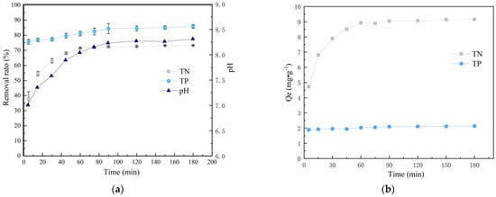 Effect of adsorption time on ammonium and phosphorus removal. (a) Change graph of removal rate with increasing contact time, (b) change graph of unit adsorption capacity with increasing contact time (CP0 = 10 mg/L; CN0 = 50 mg/L; pH = 7.0; T = 25 °C; adsorbent dosage = 4 g/L).