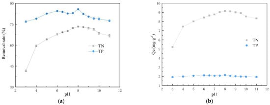 Effect of solution pH value on simultaneous ammonium and phosphorus removal. (a) Change graph of removal rate with increasing pH value, (b) change graph of unit adsorption capacity with increasing pH value (CP0 = 10 mg/L; CN0 = 50 mg/L; pH = 7.0; T = 25 °C; adsorbent dosage = 4 g/L; t = 90 min).