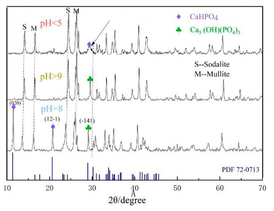 As the pH of the solution increases from 3.0 to 11.0, the removal rate of ammonium shows an increase followed by a decrease, and the best removal effect is achieved at pH = 8. Under acidic conditions, the ammonium ions in the solution mainly exist in the form of NH4+. At pH < 5, due to the high concentration of H+ in the solution, H+ will compete with NH4+ for adsorption, making the SOD less effective in removing ammonium per unit of adsorption. With increased pH, NH4+ exists as NH3·H2O when pH > 9 (Equation (7)), resulting in poor removal rates [36]. When the pH ranges between 3–11, chosen for the experiments, phosphate is mainly present in two forms, HPO42−/H2PO4−. At pH < 7, the concentration of H2PO4− is high. As the pH ranges between 7–10, it is mainly in the form of HPO42−. At pH > 10, H2PO4− is in the majority, and a small amount of PO43− also presents. There is an interconversion between different forms of phosphate (Equations (8)–(10)). For phosphorus removal, an “M” shape can be observed in the graph, with the best removal at pH = 8. Under either over-acidic or over-alkaline conditions, the release of Ca2+ and the generation of calcium phosphate precipitation are not favorable, leading to low adsorption rates at pH < 5 and pH > 9 [37]. Observation of the adsorbed precipitates reveals the production of flocs (Figure 8), and two precipitates of calcium phosphate are found in combination with XRD (Figure 9) analysis. It is further shown that phosphorus removal is mainly by generated insoluble precipitates with Ca2+ and settling on the surface of Fe2O3 and Al2O3 again by ligand exchange adsorption.
