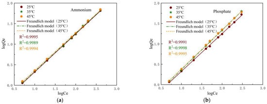 Freundlich isotherm plots for the adsorption of ammonium (a) and phosphate (b) onto the SOD.