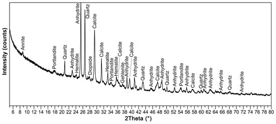 Fluidized fly ash (class C (ASTM C618)) from Czech thermal power plant (Tisova, CEZ Group, Brezova, Czech Republic) was used for the preparation of laboratory samples. Typical features of all fluidized fly ashes, as seen in the chemical analysis (Table 1), are high in SO3 content (2.5 wt. % according to chemical composition in the form of anhydrite CaSO4) and CaO (usually up to 15%—as a calcite CaCO3 and anhydrite) (Figure 1) without the glass phase or mullite, which are typical main mineralogical phases of CFAs. Class C fly ash creates irregularly shaped sharp-edged particles due to lower firing temperatures (Figure 2).