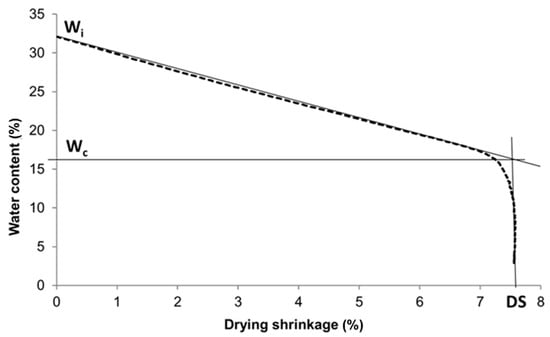 - The specimen was dried at 110 °C until the weight became constant, and the length of the dried specimen was measured to calculate the drying shrinkage (DS). The graph of the relationship between shrinkage and water content was plotted (Bigot curve). The Drying Sensitivity Index—Bigot DSI-B was calculated using the following equation:where:DSI-B = [(Wi − Wc)·DS]/100Wi is the initial water content of the dough during test samples’ preparation (%);Wc is the critical water content of test samples subtracted from the Bigot curve (Figure 3) (%);