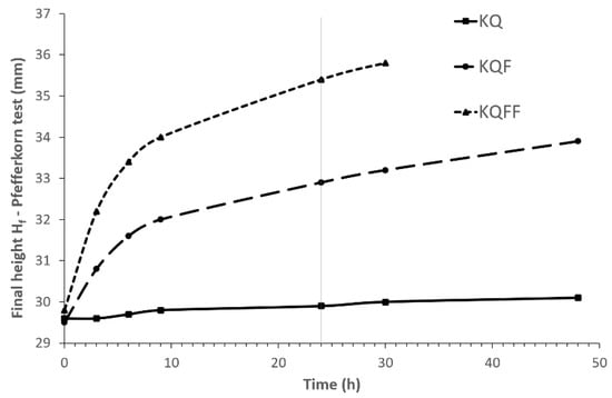 While ageing the dough, the CCFA content (KQF, KQFF) solidifies—the final height Hf of the deformed cones after the Pfefferkorn test (Figure 4) increases in time, with an increasing volume of CCFA in the raw materials mixture. There is evidence that the KQ mixture without CCFA shows relative constant plasticity during the ageing, and the admixture of CCFA increases Hf very intensively, especially in the first 10 h of ageing. The KQFF mixture with the highest fly ash content (20 wt. %) lost its plasticity after 30 h of measuring (Figure 4 shows the end of the measuring process—the value Hf = 36 mm can no longer be considered a plastic state).