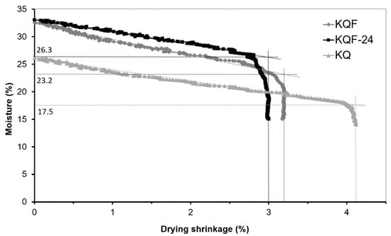 A more pronounced effect of solidifying the prepared ceramic dough during the ageing can be observed in the Bigot curve if 20% fly ash (KQFF) is used, as critical water content Wi is reached much earlier, and DS is reduced. Both of these effects are even more intense after the dough has aged for 24 h. Thus, the DSI-B value decreases with increasing fly ash content, as does the dough’s ageing.