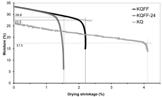 - The dough of the raw material mixtures KQ, KQF and KQFF (Table 4) was made by adding an appropriate amount of initial (mixing) water (Wi) determined by the Pfefferkorn test. The test samples were then formed into a rectangular bar of 100 × 50 × 20 mm3 by hand with the help of a metal form. Some of them were wrapped with a plastic film and kept at room temperature for 24 h ageing (samples KQ-24, KQF-24, KQFF-24) to describe the Bigot curve of the aged body with higher Hf (Figures 4, 5 and 6). The dough’s ageing refers to the process of the dough maturing with mixing water (to achieve Hf = 30 mm) in a plastic cover without the possibility of drying;