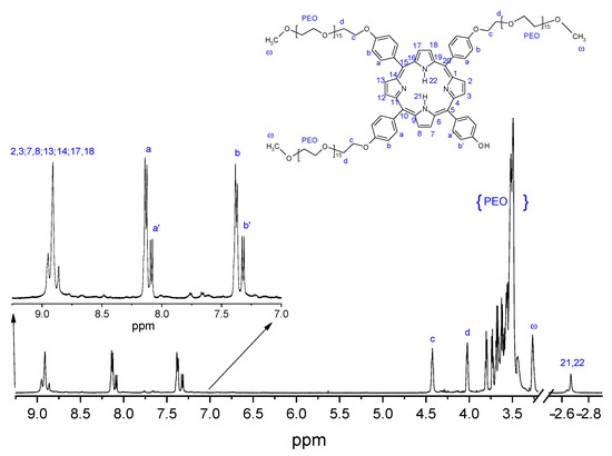 NMR experiments also confirmed the chemical structure. In particular, the spectrum (Figure 2) shows the overlapped signals of the pyrrole protons at 8.91 ppm, arising from their different chemical surroundings. The signals at 8.08 and 7.32 ppm, attributed to protons a′ and b′, further confirm the molecular structure. The presence of the PEG chains is revealed by the unresolved triplets between 4.46 and 3.4 ppm. Finally, at 3.25 ppm, the signal of methyl groups is also evident.