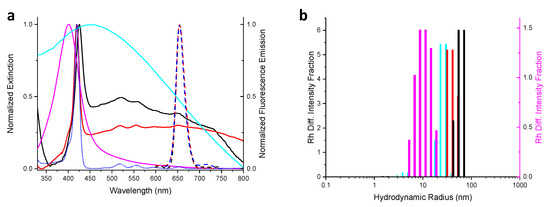 (a) UV-Vis spectrum of AgNPs (water, magenta line), P(PEG350)3 (acetone, dotted blue line), AgNP@ClPT (acetone, cyan line), AgNP@P(PEG350)3 in acetone (red line) and water (black line). Fluorescence emission spectra (λexc = 420 nm) of P(PEG350)3 (acetone, blue dashed line), AgNP@P(PEG350)3 in acetone (red dashed line) and water (black dashed line, overlapped with the blue one). (b) Hydrodynamic radius distribution of AgNPs (water, magenta), AgNP@ClPT (acetone, cyan), AgNP@P(PEG350)3 in acetone (red) and water (black).