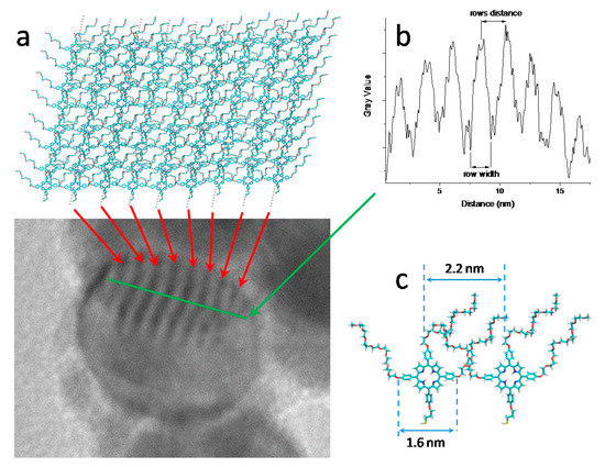 The morphology and size of AgNP@P(PEG350)3 were studied through TEM experiments. The size of hybrid nanoparticles was revealed in the range of 15–30 nm (Figure 6a). The obtained average values also support the DLS results. Moreover, it is evident that the AgNPs structural properties were preserved in AgNP@P(PEG350)3, as confirmed by the diffraction pattern (Figure 6b). It is noteworthy to highlight the presence of nanopatterned structures onto the AgNP@P(PEG350)3 surface (Figure 6a, red arrow, and Figure 7a, bottom), evidenced by dark parallel rows overlapped to the functionalized AgNPs. The analysis of the nanopatterns (Figure 7b) revealed a profile having the mean row width of about 1.59 ± 0.17 nm and a distance between the rows’ centroid of about 2.14 ± 0.16 nm. Such evidence is attributable to the self-organization of the porphyrin molecules during the covalent linkage onto the metal nanoparticles. To confirm this hypothesis, a computer simulation of the edge-to-edge arrangement of two P(PEG350)3 molecules, obtained employing the Molecular Mechanics (MM+) algorithm, was performed. The calculation shows a width of the porphyrin structure (Figure 7c) of about 1.6 nm, and a distance between the adjacent porphyrins of about 2.2 nm (Figure 7c), confirming the hypothesized arrangement onto the metal nanoparticles. Moreover, a face-to-face self-organization determines the formation of the organized rows (Figure 7a, top). It is also noteworthy that the distance between the porphyrin planes in the face-to-face arrangement does not involve any transition dipole moment coupling (as confirmed by UV-Vis measurements, Figure 4a), probably because of the sterical hindrance of the PEG branches.