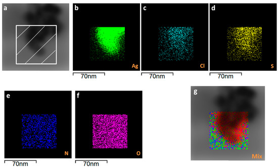 STEM of AgNP@P(PEG350)3 (a) with elemental analysis mapping (b–f) in dashed area of image (a) and their total merged composition (g).