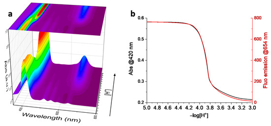 UV-Vis HCl-diluted solution titration of P(PEG750)4 water solution (5 μM): (a) 3D representation of the UV-Vis spectra acquired during the H+ titration; (b) titration curve obtained monitoring the UV-Vis absorbance at 420 mn (black line) and the fluorescence emission intensity at 654 nm (red line, λexc = 420 nm).