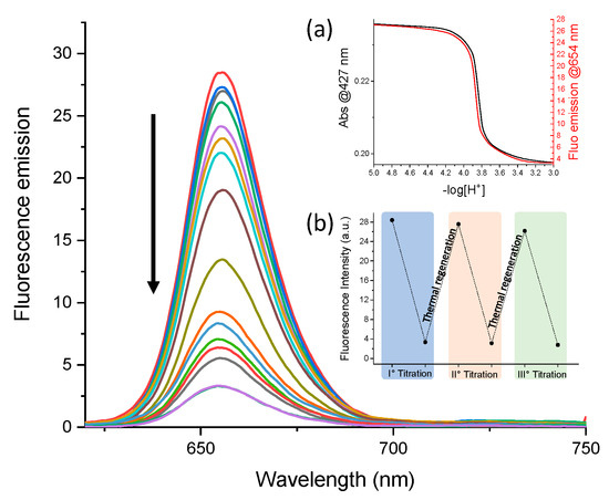 Spectrofluorimetric HCl titration of AgNP@P(PEG350)3. Inset: (a) titration curves obtained monitoring the fluorescence emission intensity at 654 nm (red line) and the UV-Vis absorbance at 427 nm (black line); (b) fluorescence emission intensity variations (at 654 nm) of AgNP@P(PEG350)3 aqueous solution during HCl titrations cycles.