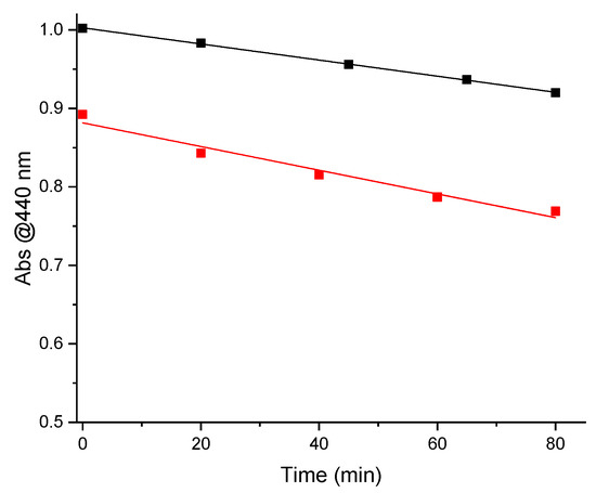 Absorbance variations (λ = 440 nm) of AgNP@P(PEG350)3 (black full square) and TPPS (red full square) aqueous solution in function of the irradiation time. The related lines represent the linear fit of the experimental data.