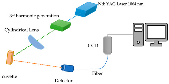The DAP was dissolved in ten organic solvents (spectroscopic grade of 99.8% purity); Table 1 lists the used solvents. Under a wide range of concentrations, the optical properties, such as absorption and fluorescence, were recorded using a crystal quartz cuvette. The absorption spectra of DAP were measured for a wide range from 100–1000 nm using a Perkin-Elmer Lambda 950 UV-vis-NIR Spectrophotometer (Waltham, MA, USA), which has a double monochromator with holographic grating and double beam with ratio recording organized by a computer. For emission spectra, the Perkin-Elmer LS55 spectrofluorometer (Waltham, MA, USA) range was used in the range of 200 to 900 nm, at room temperature. The excitation wavelength was fixed at 355 nm for all samples. A quartz plano-cylindrical lens with a focal length of 5 cm is used to focus the UV laser, as a transverse pumping technique, on the sample [21]. The ASE beam is confined using optical fiber and analyzed by a charge-coupled device (CCD) camera, Solar M226 (Minsk, Belarus), as shown in Figure 2.