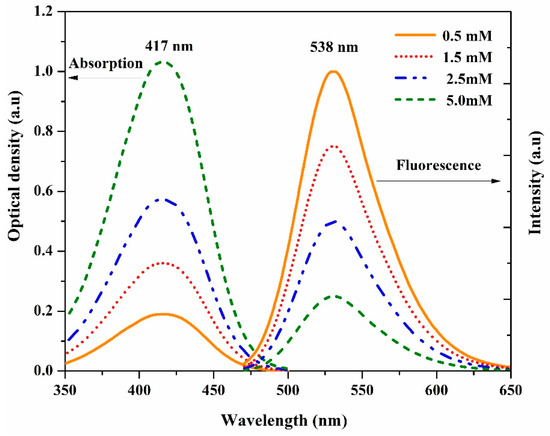 The DAP was dissolved in acetonitrile (AN) under a wide range of concentrations (0.5 to 5 mM). The absorption spectra exhibited a single band at 417 nm, as shown in Figure 3. By increasing the concentration, no new peak appeared, which implies the absence of dimer formation in all used concentrations. The fluorescence spectra of DAP in AN showed a single peak at 538 nm, for all mentioned concentrations, as observed in Figure 3. One can observe that the intensity decreased with increasing the concentration. This behavior might be due to the association of two excited molecules in the excited state with the solvent (superexciplex stabilization in the high dielectric environment). This rare phenomenon was observed in few dyes and conjugated polymers [15,29].