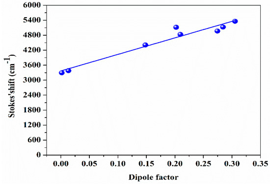 This dipole factor in Equation (2) measures the dipole–dipole interaction between the solvents and the solute [13,31].The results show that DAP exhibited significant Stokes shifts (up to 5000 cm−1), as displayed in Figure 4. Upon comparing DAP with the rhodamine and coumarin series, it is found that the polarity of the DAP is greater by 150 orders of magnitude than the conventional organic dyes.