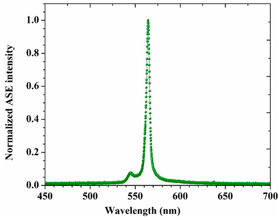 A solution of 1.5 mM in AN, as a high polar solvent, was prepared and transversely excited using the third-harmonic generation of an Nd: YAG laser pulses (355 nm) with sufficient energy of 3 mJ; this is the lowest concentration and pumping power energy required to obtain the ASE spectrum. A dual ASE peak appeared, with two narrow spectral regions, one at 545 and another at 565 nm, with full width at half maximum (FWHM) of 8 nm for each peak (see Figure 5). The ASE peak at 545 nm corresponds to the fluorescence peak at 541 nm, and there is no fluorescence band at 565 nm corresponding to ASE at 565 nm. Based on the obtained results, one can attribute the peak at 565 nm to the presence of the superexciplex state [32,33,34,35].