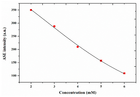 Figure 7 shows the ASE intensities vs. concentrations of the DAP in AN, with pumping power excitation at 6 mJ. The results revealed that the ASE peak (565 nm) decreases rapidly as the concentration increases, which may be due to the association of two excited molecules in the excited state with the solvent (superexciplex). Miasojedovas et al. attributed the reduction in the ASE intensity vs. the increasing substituted perylene diimide derivatives PDI content to the reduced intermolecular separation that led to diminishing the optical losses and lowering of the ASE intensity [36].