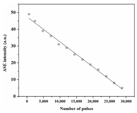 The ASE stability of the 5 mM solution of DAP in AN was measured under 6 mJ and 1 Hz pump power energy and repetition rate, respectively, using a 355 nm pulsed laser source. The solution was never circulated or stirred. After almost 4 h (15,000 pulses), the output intensity dropped 50% of its original performance (see Figure 8).