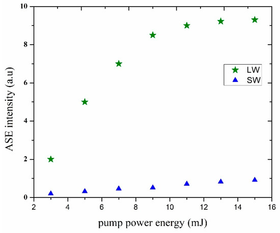 Figure 9 illustrates the increase of the ASE intensity as a function of the pumping power energy for a fixed 1.5 mM of DAP solution in AN. For a pump power energy from 3 to 15 mJ, the recorded intensities for the dual ASE peak were one for the short-wavelength (SW) at 545 nm, and another at 565 nm long-wavelength (LW). One can see the saturation of the LW intensity for pump power more than 9 mJ [5].