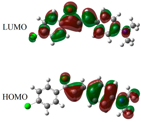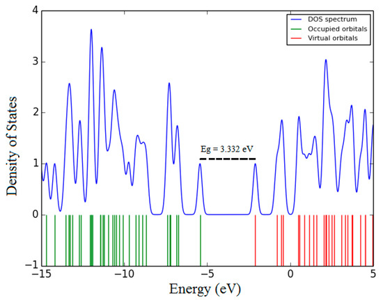 The theoretical data, including the highest occupied molecule orbital (HOMO) and the lowest un-occupied molecular orbital (LUMO) transitions, molecule dipole moment (µD), total energy (ET), and energy band gaps (Eg), were calculated using DFT, as shown in Table 2. Figure 10 and Figure 11 show the density of states diagram and the HOMO–LUMO of DAP, respectively.