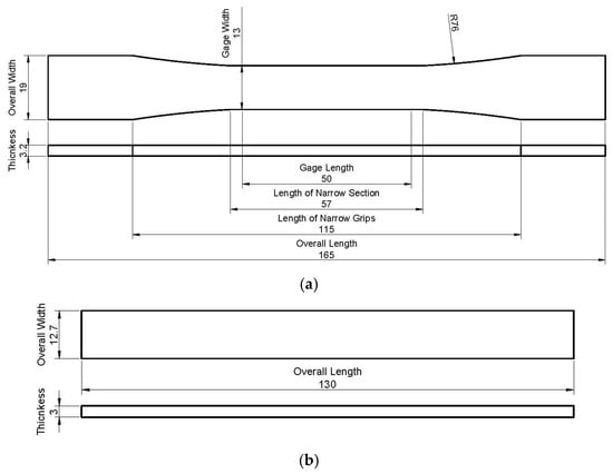 Dimension of samples [mm] for (a) tensile test; (b) bending test.