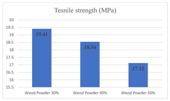 - With the addition of wood powder, the strain values reduce. Accordingly, the relation σ = Eɛ, with the increased Young’s moduli and decreased strain value reduction of tensile strength is obtained [30,31].