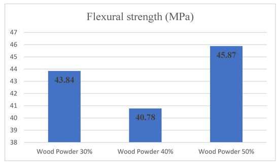 Figure 8 shows the changes in flexural strength relative to changes in the amount of wood flour. Examining the variance analysis in flexural strength showed that changes in the amount of wood at levels of 30%, 40% and 50% significantly affected the level of statistical confidence of 95%. Duncan grouping also divided the three levels of wood flour into two separate groups to assess the wood particles’ impact on flexural strength. The specimens containing 30% and 40% by weight of wood particles are in the first group with the least amount of flexural strength, and the 50% by weight wood particles are in the second group with the highest amount of flexural strength.