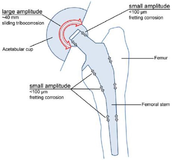 In the particular case of orthopedic implants, micro-motions are known to occur at the points of fixation, while corrosion is caused by the body fluids, which contain various inorganic and organic molecules (see Figure 1) [3].