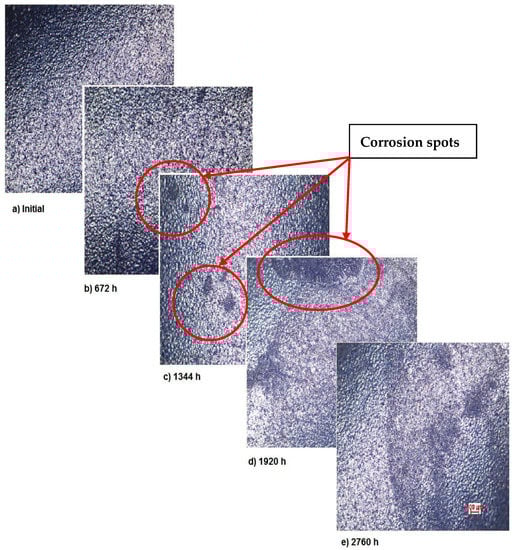 Figure 5 presents the surface modifications implied by the corrosion for sample 1. As mentioned above, the corrosion appears during the first month of exposure and starts from the fine scratches on the metal surface. Over time, the surface corrosion spreads on the entire surface, thus showing the corrosion type as in Figure 2. However, the surface transformations highlight the formation of a new protective layer. Image analysis indicates the occurrence of corrosion starting from the first month of immersion and corrosion stopping after the third month. This is a strong indicator of the material’s stability.